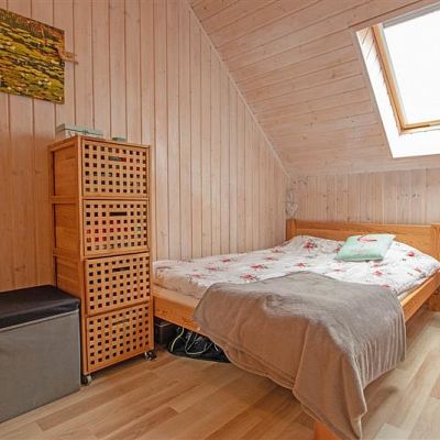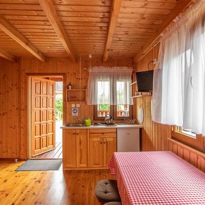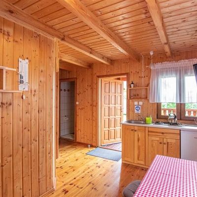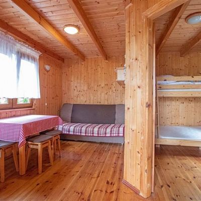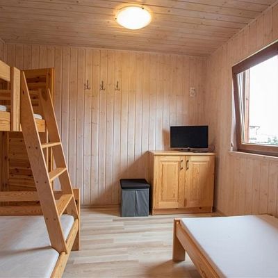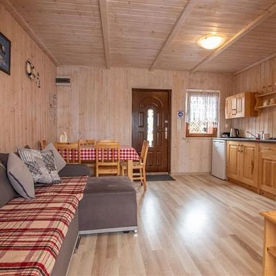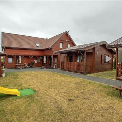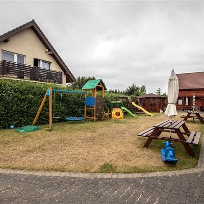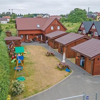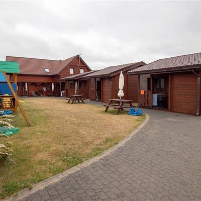 Teren zagospodarowany, ogrodzony, parking, plac zabaw, tereny zielone, miejsca na rowery. Łącznie 41 miejsc noclegowych.