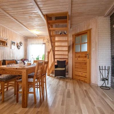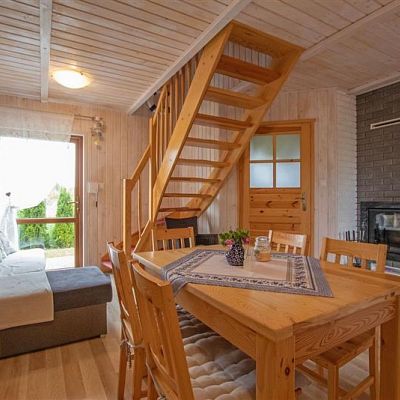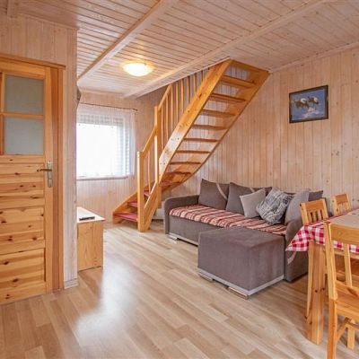 • Domki w bardzo wysokim standardzie, sprzedawane z całością wyposażenia i meblami. Wszystkie meble drewniane robione na zamówienie, okna PCV w okleinie drewnianej, okiennice.