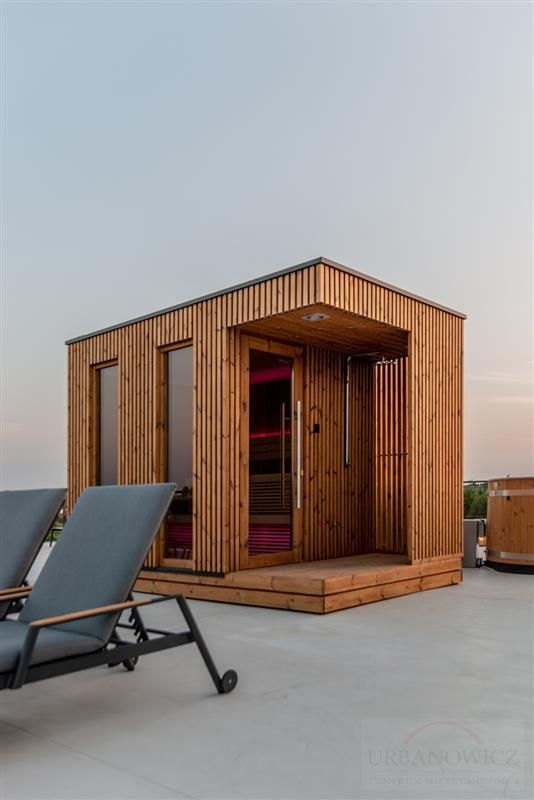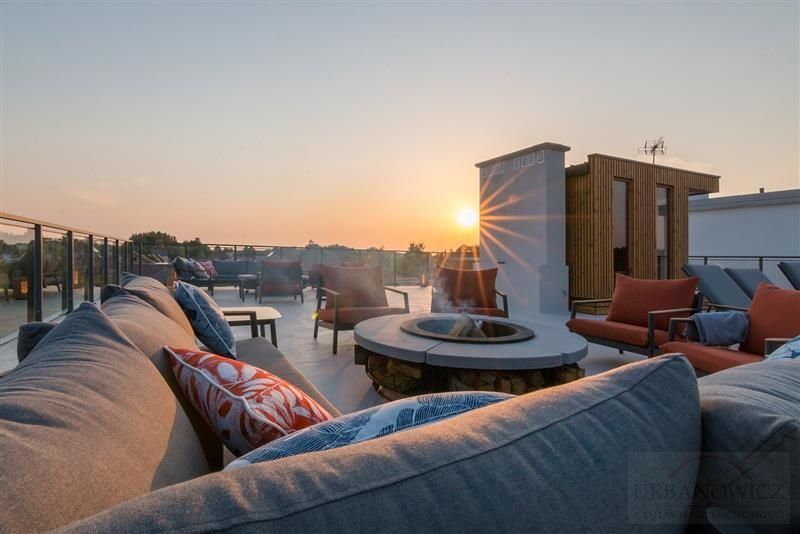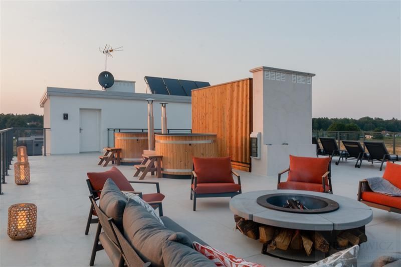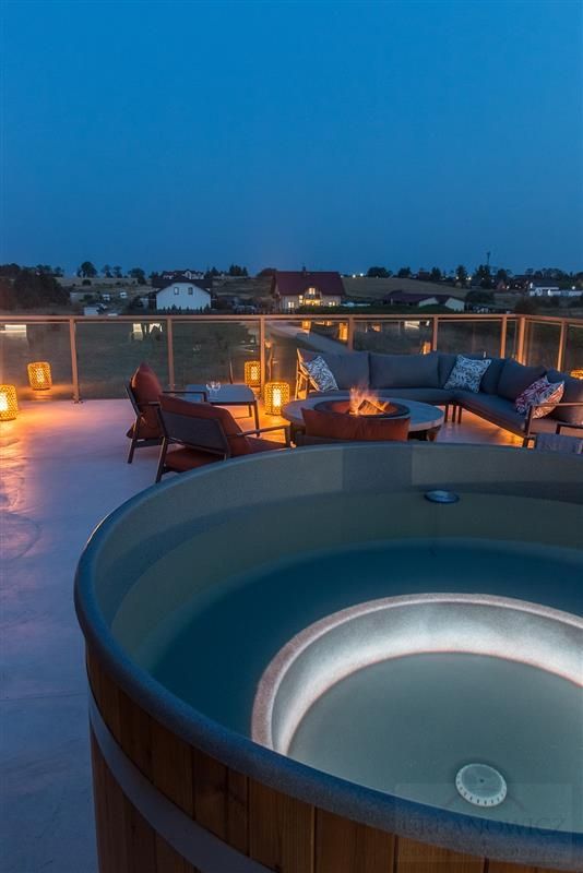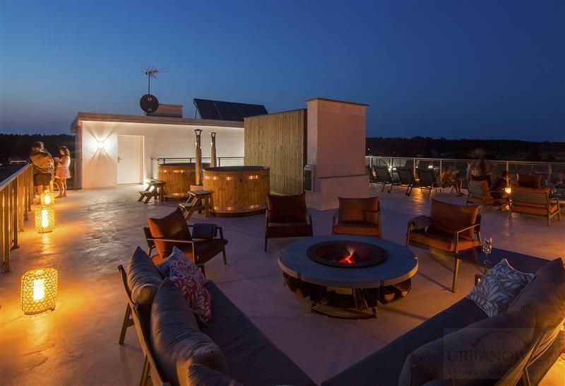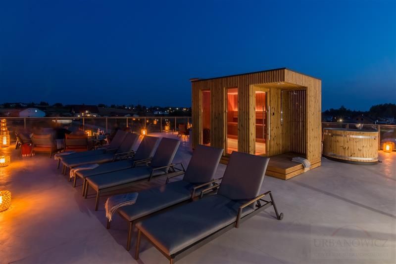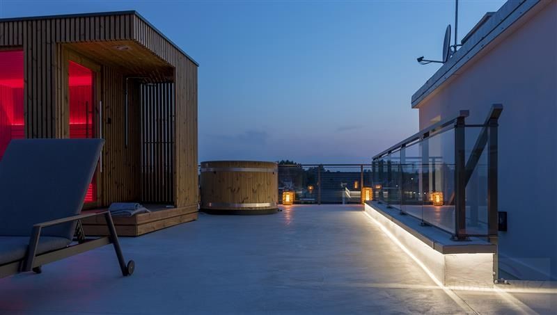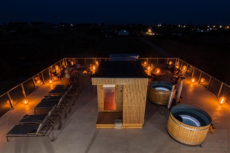 Na dachu budynku znajduje się mała strefa SPA z sauną suchą, balie opalane drewnem oraz strefa Ognia.