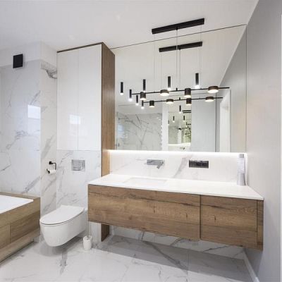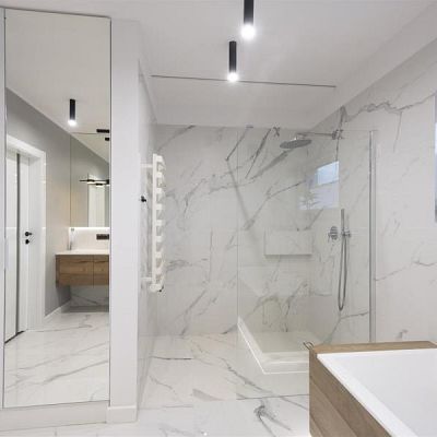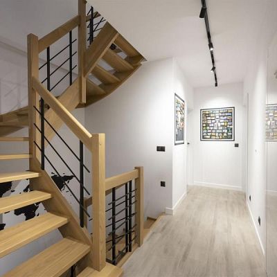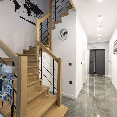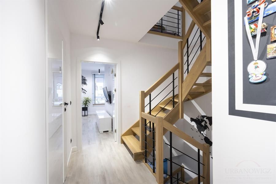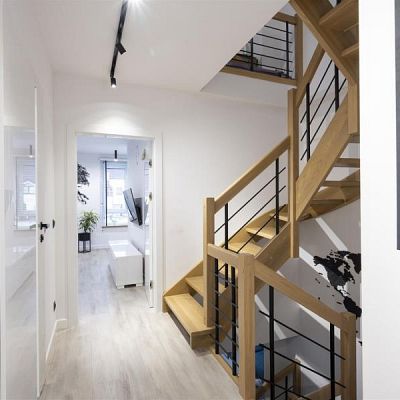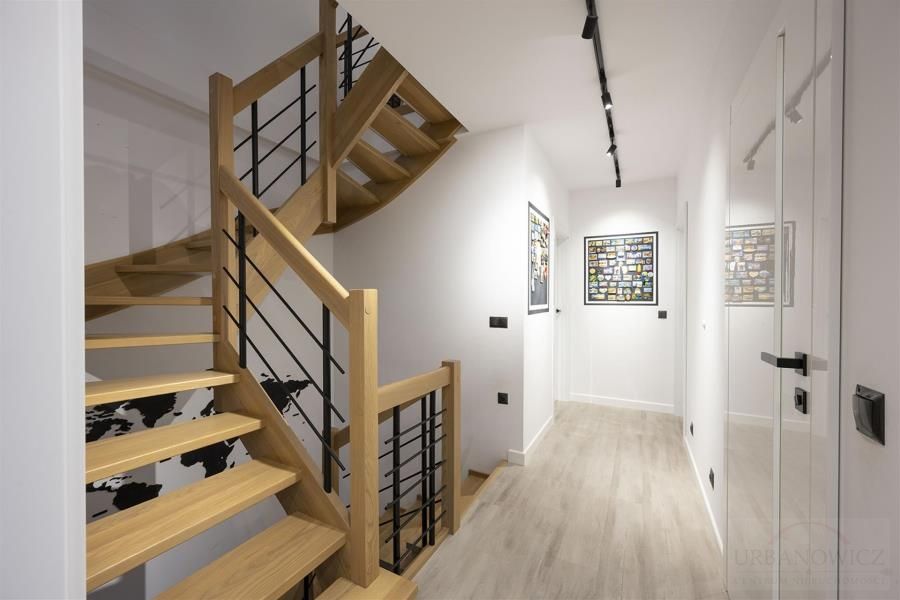 Na piętra prowadzą schody drewniane, w pokojach ściany gładź malowana na podłogach panele. Łazienka z kabiną prysznicową i wanną.