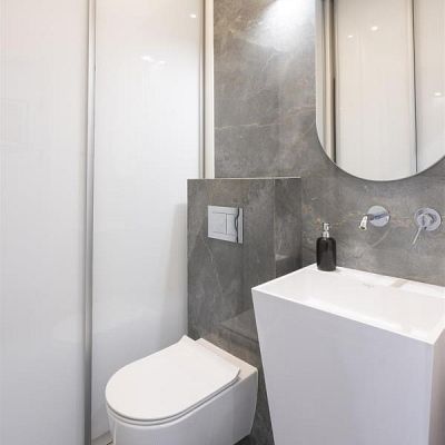 Na parterze została wygospodarowana osobna przestrzeń pod działalność gospodarczą z osobnym wejściem z aneksem kuchennym i WC.