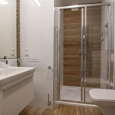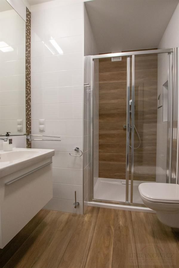 W łazience - kabina natryskowa, kompakt, przyłącze do pralki.