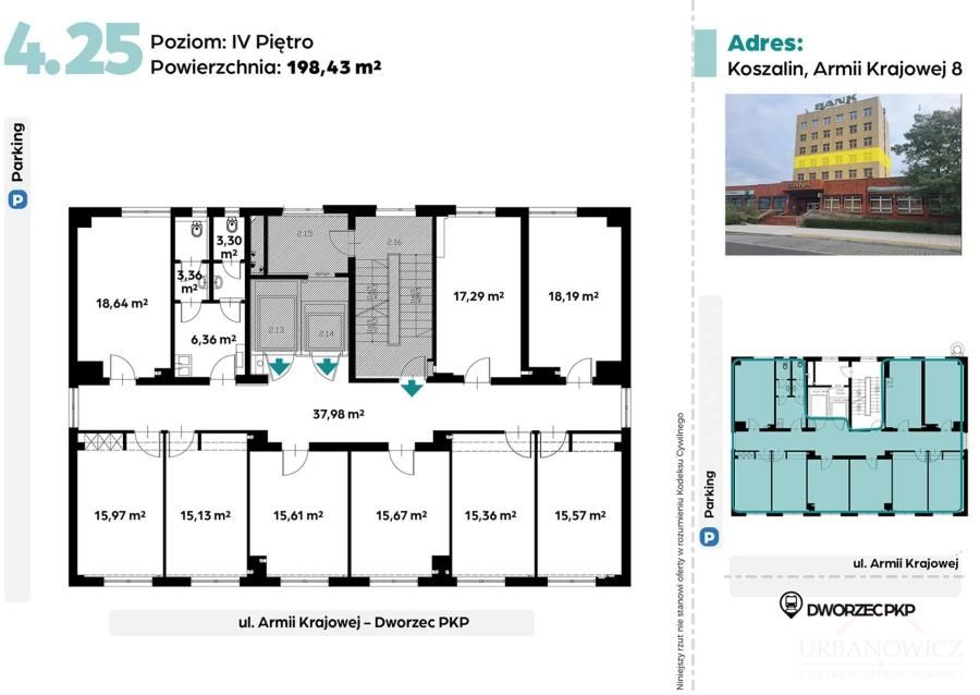 Na sprzedaż przestronny lokal usługowy o powierzchni 198,43 m², zajmujący całe czwarte piętro prestiżowego budynku w ścisłym centrum Koszalina.