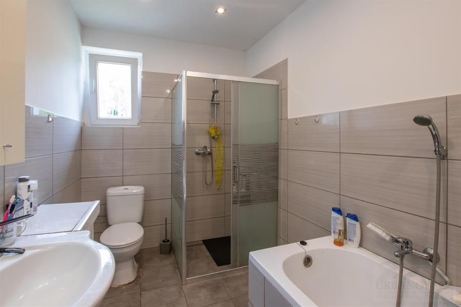 Okna PCV, dachowe Vellux, podłogi terakota i panele, łazienka - wanna i kabina, bojler elektryczny.