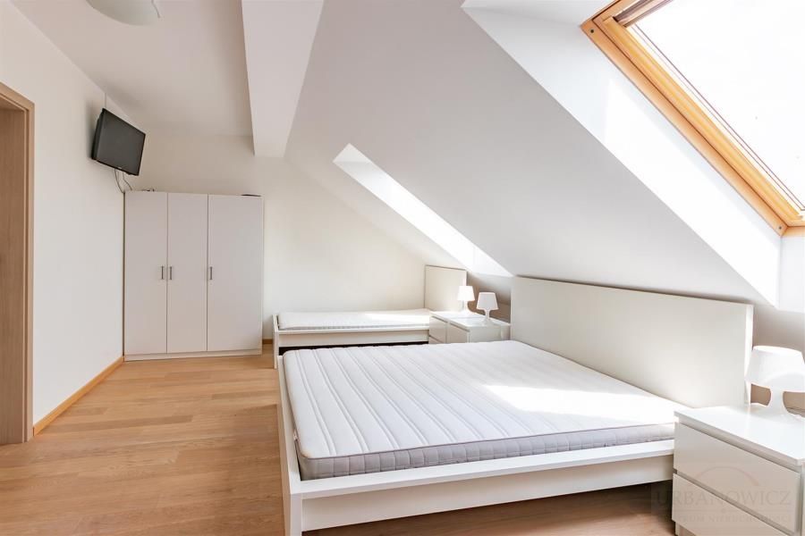 - II piętro: dwie sypialnie z prywatnymi łazienkami.