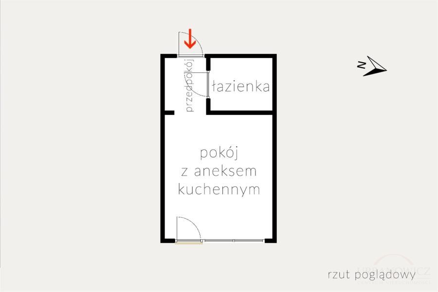 Rozkład pomieszczeń: pokój z aneksem i łazienką - pow. 14,90 m2;