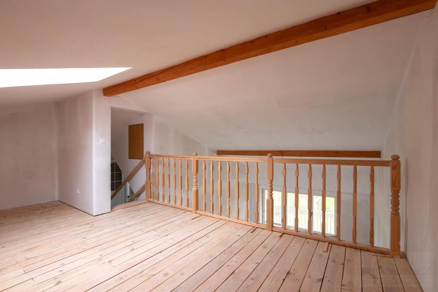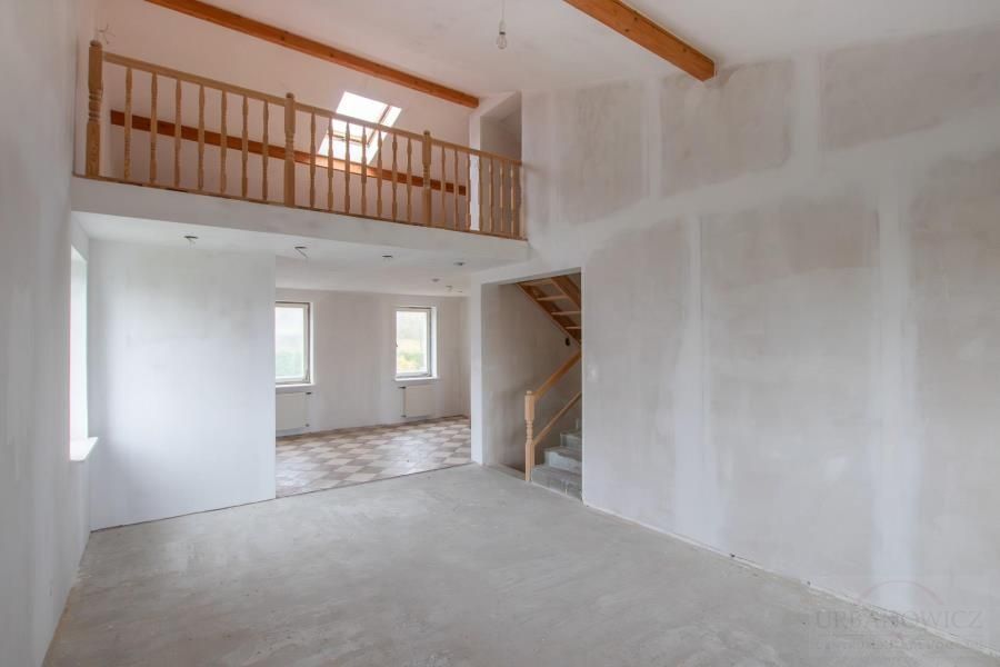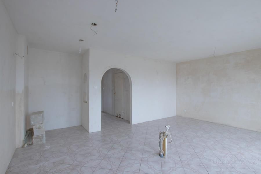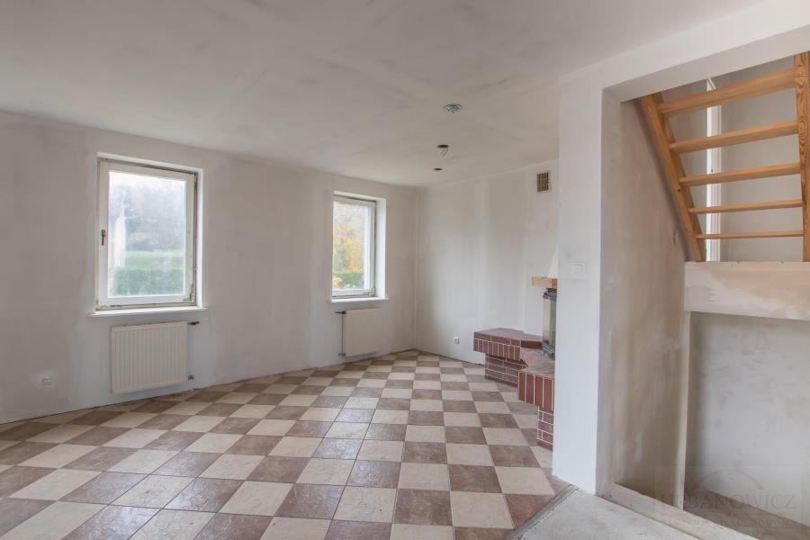 Okna PCV oraz drewniane, podłogi w kuchni z jadalnią - terakota, w pokojach wylewki cementowe, ściany tynki gipsowe.