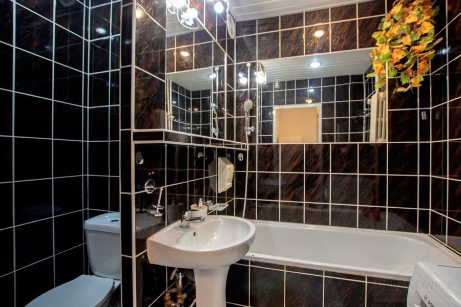 Łazienka: terakota, glazura, umywalka, wanna, kompakt, pralka.
