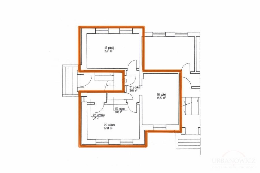 Do mieszkania przynależy piwnica o pow. 7,40 m2 oraz pom. gospodarcze na strychu o pow. 1,50 m2.