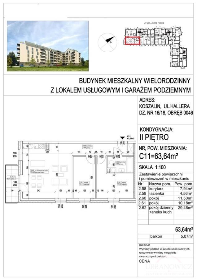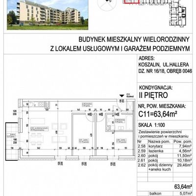 Mieszkanie 3-pokojowe o pow. 63,64 m2, na2 piętrze, z balkonem pow. 5,07 m2. Budynek z windą.