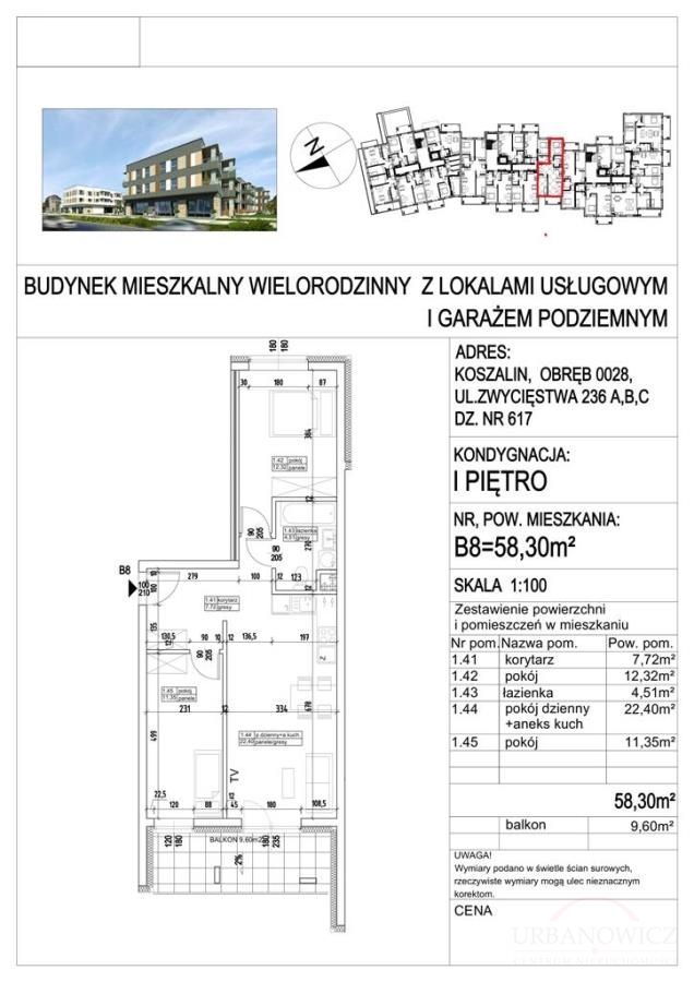 Mieszkanie 3-pokojowe, o pow.58,3 m2, na I piętrze, z balkonem(9,60 m2) - (zobacz plan mieszkania). Mieszkanie jest sprzedawane w stanie deweloperskim, do wykończenia.