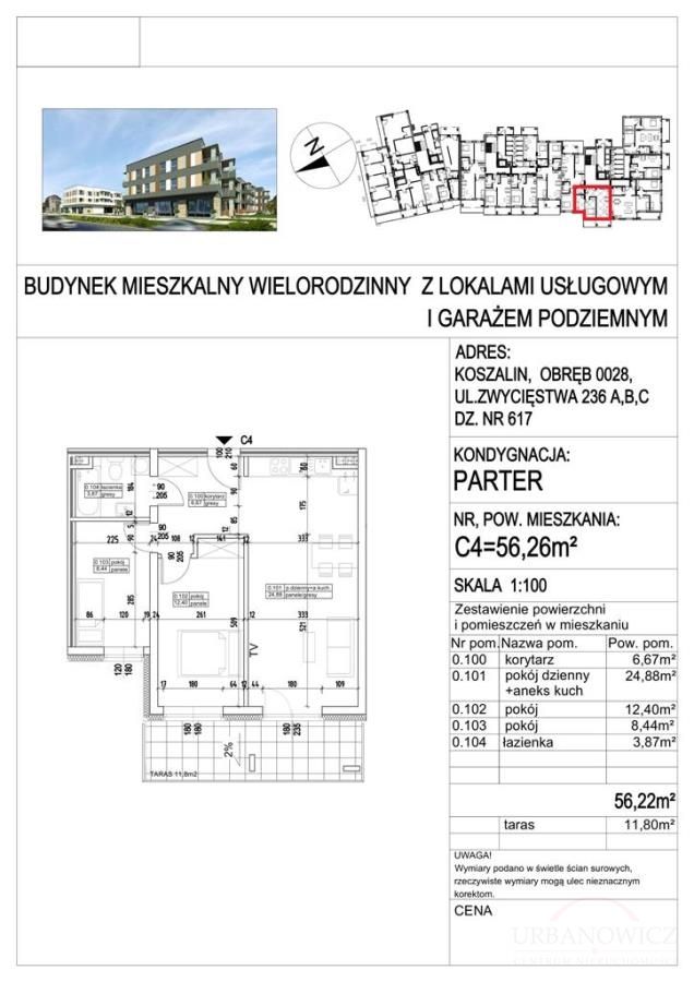 Mieszkanie 3-pokojowe, o pow.56,09 m2, na parterze, z tarasem (14,90 m2) - (zobacz plan mieszkania). Mieszkanie jest sprzedawane w stanie deweloperskim, do wykończenia.