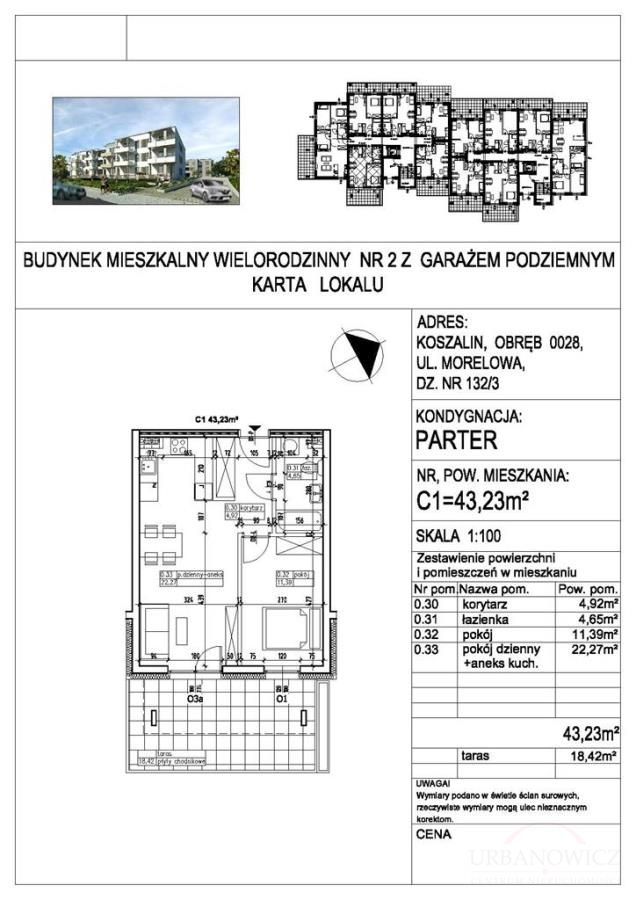 Mieszkanie 2-pokojowe, o pow. 43,23 m2, na parterze, z tarasem (18,42 m2) - (zobacz plan mieszkania). Mieszkanie jest sprzedawane w stanie deweloperskim, do wykończenia.