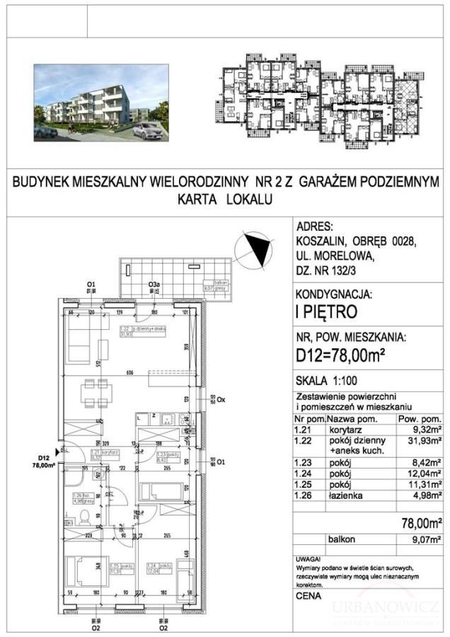 Mieszkanie 4-pokojowe, o pow. 78 m2, na I pietrze, z balkonem (9,07 m2) - (zobacz plan mieszkania). Mieszkanie jest sprzedawane w stanie deweloperskim, do wykończenia.