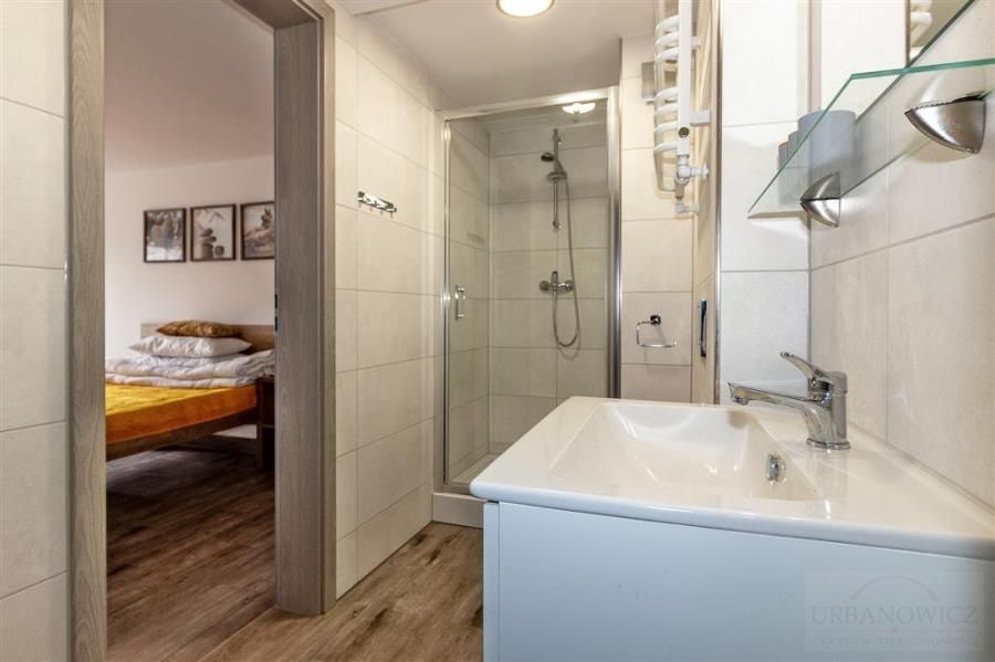 Budynek murowany 3-kondygnacyjny, o powierzchni całkowitej 350m2, w którym znajduje się łącznie 10 pokoi 2 - osobowych (możliwość dołożenia dostawek) + sypialnia i kuchnia dla właściciela na II piętrze. W sumie około 20 miejsc noclegowych (30 miejsc noclegowych z 1 dostawką w każdym pokoju).