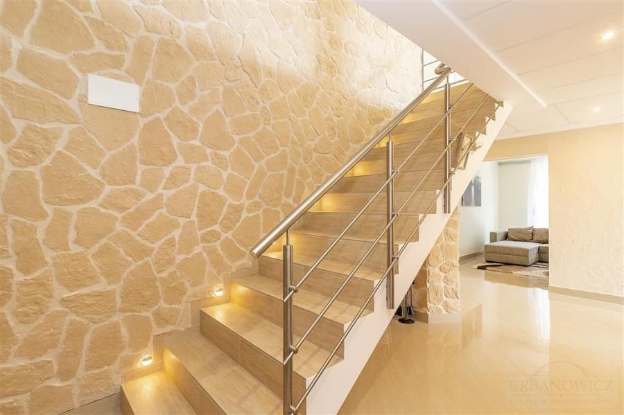 Pięknie zagospodarowana posesja: liczne nasadzenia, pergole z winoroślami, zadbane trawniki. Pod powierzchnią trawnika znajdują się zbiorniki na wodę deszczową, która można wykorzystać do nawodnienia ogrodu. Cała działka ogrodzona, 2 bramy wjazdowe. Na terenie posesji znajduje się również parking na 6 aut.