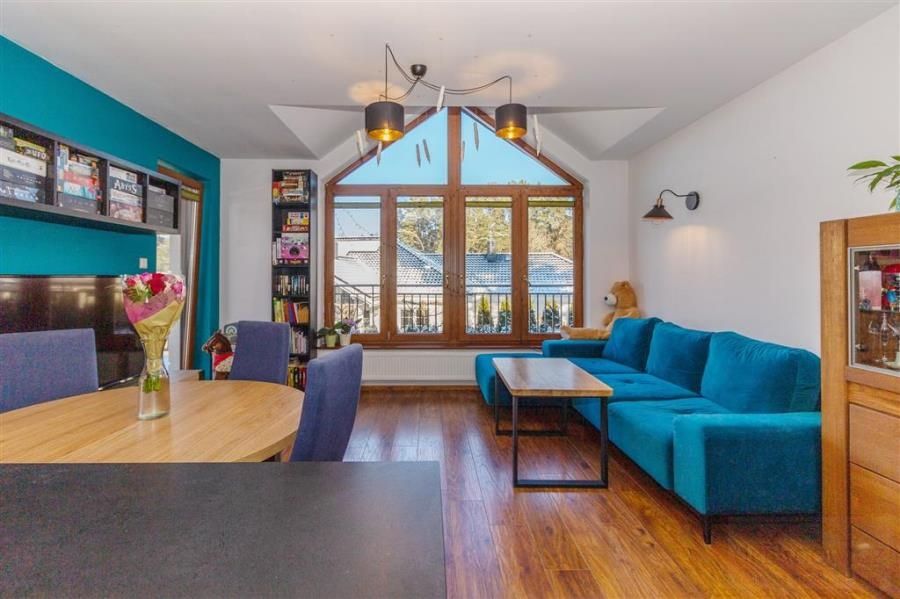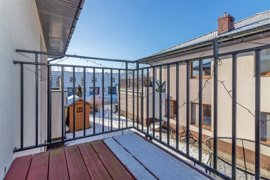 Z salonu wyjście na balkon, z głównej sypialni wyjście na przestronny słoneczny taras usytuowany nad garażem.