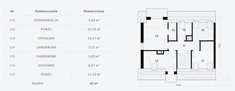 Rozkład pomieszczeń: kuchnia (6,67 m2), salon połączony z jadalnią ( 21,80m2), 3 pokoje (11,10m2; 12,72m2; 5,03m2), łazienka (8,27m2), wc (2,47m2), wiatrołap (3,80m2), komunikacja (3,70m2; 5,60m2), sypialnia z garderobą (17,28m2), garaż (22,26m2) oraz kotłownia (4,60m2). Dodatkowo od strony ogrodu projekt został wzbogacony o 22 m2 tarasu.