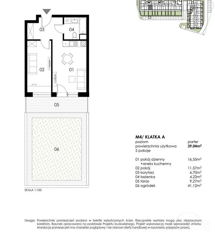 Przedstawiamy dwupokojowy lokal mieszkalny oznaczony symbolem A M4 o pow. 39,04m2, położony na parterze.