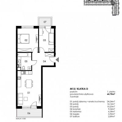 Przedstawiamy trzypokojowy lokal mieszkalny oznaczony symbolem D M13 o pow. 64,75m2, położony na I piętrze.