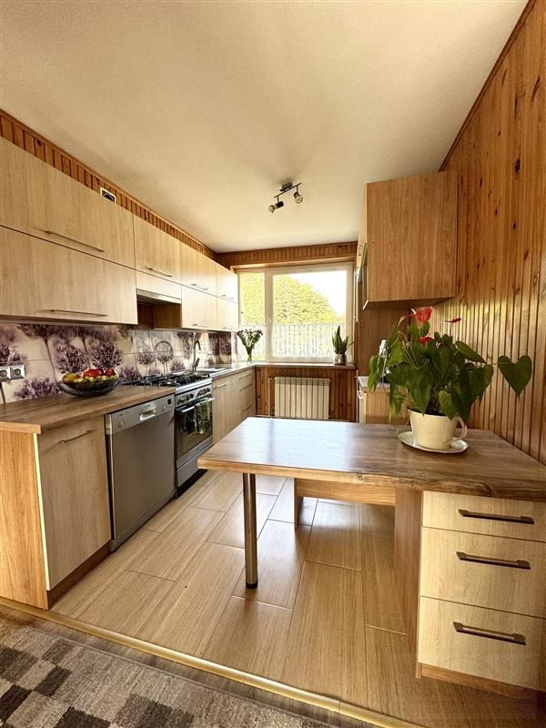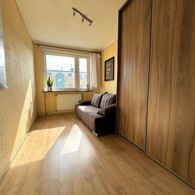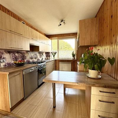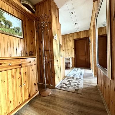 Okna PCV. W pokojach i w przedpokoju na podłogach panele, w salonie ściany malowane, w pokojach tapety, w przedpokoju boazeria.