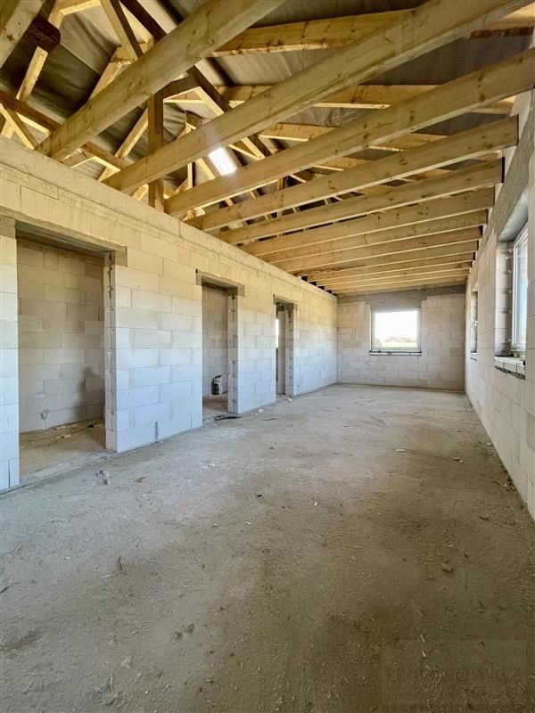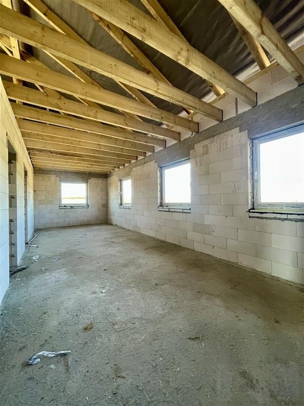 stan surowy zamknięty – materiał budowlany: Suporex, okna (PCV trzyszybowe) i drzwi zewnętrzne (techniczne) zamontowane, brama garażowa oraz dach wykonany,
