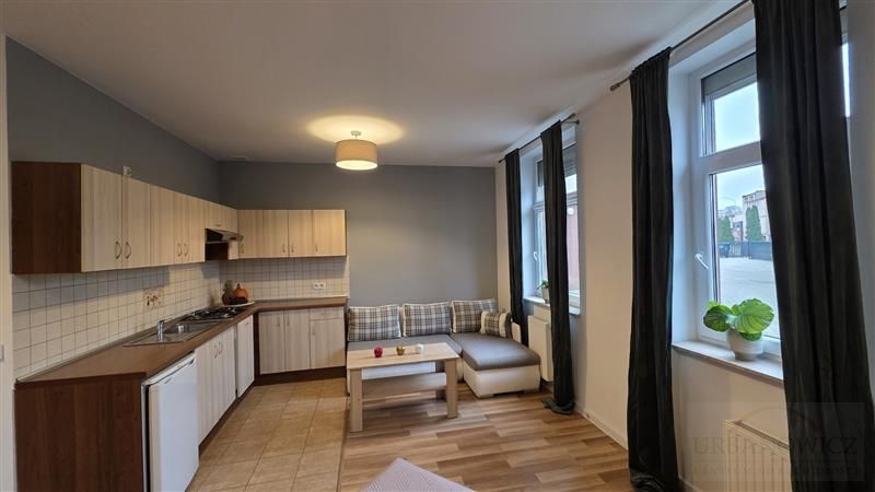 Bardzo ładnie doświetlony. W oknach żaluzje. Kuchnia zabudowa kuchenna, płyta indukcyjna, lodówka, mikrofala, czajnik elektryczny, stół, krzesła.