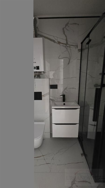 W łazience znajduje się nowoczesna kabina prysznicowa, nowe płytki, armatura .