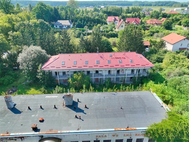 Budynek w trakcie budowy: Budynek dwukondygnacyjny w kształcie prostokąta, zlokalizowany równoległe do pierwszego obiektu, zaprojektowany pod motel. Budowa obejmuje wybudowanie na każdym z poziomów 7 segmentów mieszkalnych z sanitariatami o średniej powierzchni 24m2 ze schodami oraz galerią komunikacyjną zewnętrzną. Istnieje możliwość adaptacji poddasza na poddasze użytkowe pod dodatkowe powierzchnie mieszkalne. Dach stromy pokryty blacho dachówką w stanie dobrym.