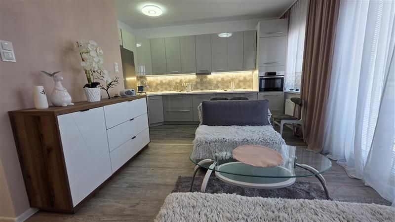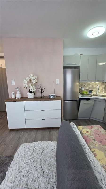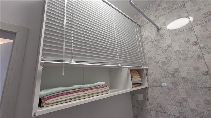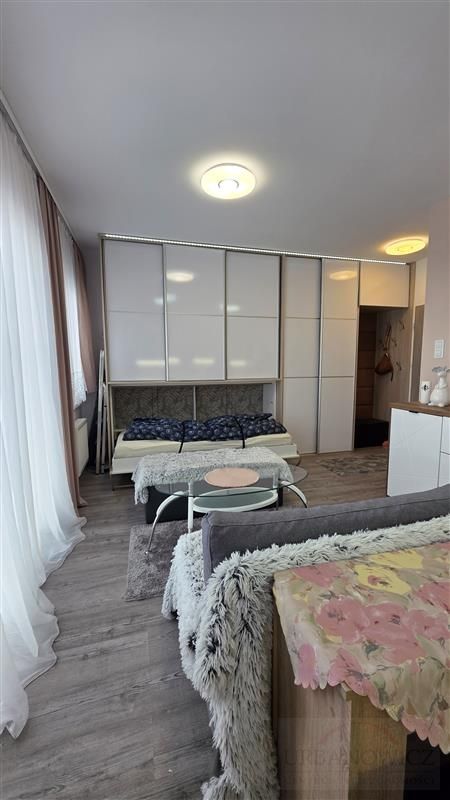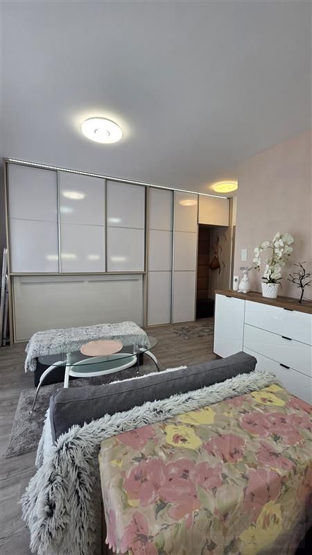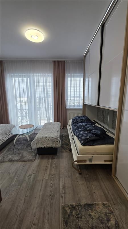 Mieszkanie składa się z przestronnego pokoju z aneksem kuchennym. Wnętrze zostało zaprojektowane z myślą o wygodzie – zastosowano nowoczesną zabudowę, która sprytnie ukrywa łóżko, dzięki czemu przestrzeń w ciągu dnia pozostaje otwarta i estetyczna. Dodatkowo w salonie znajduje się zestaw wypoczynkowy z rozkładaną kanapą.
