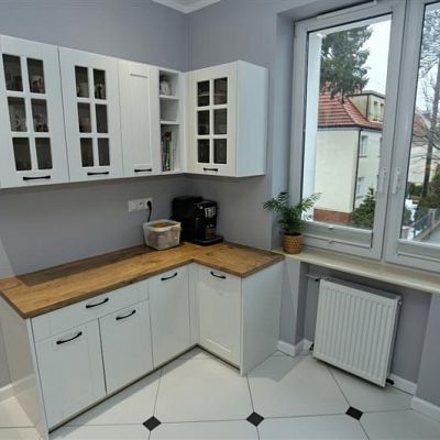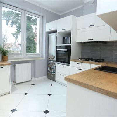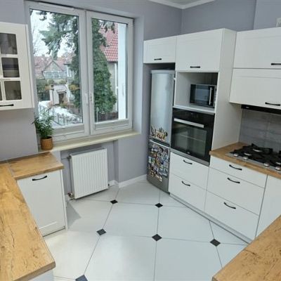 Kuchnia jest funkcjonalna i jasna, białe meble z drewnianym wykończeniem, nadają wnętrzu elegancji. Wyposażona jest w dobrej jakości sprzęty: lodówka, piekarnik, zmywarka, co zapewnia wygodę i ułatwia codzienne gotowanie.