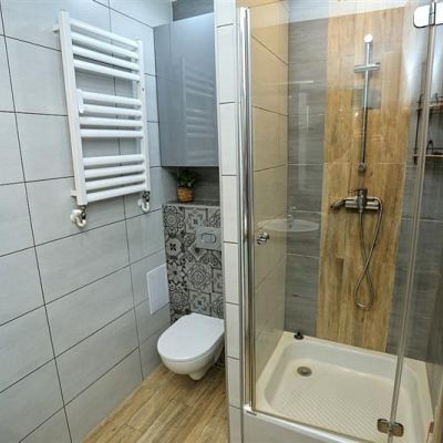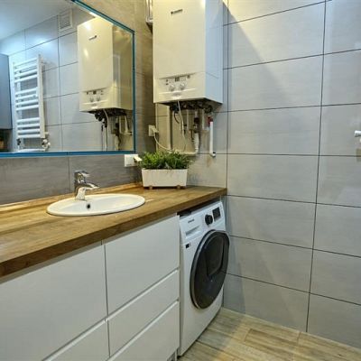W łazience znajduje się duża kabina prysznicowa oraz piękna zabudowa pod umywalkę i miejsce na pralkę.