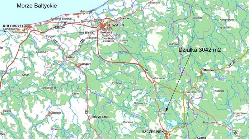 Działka z linią brzegową Jeziora Spore, gmina Szczecinek. 3040 m2.
