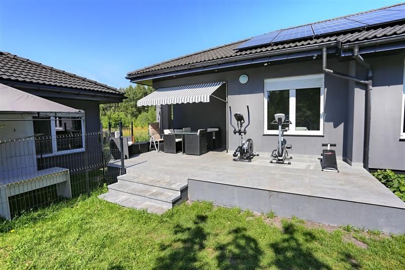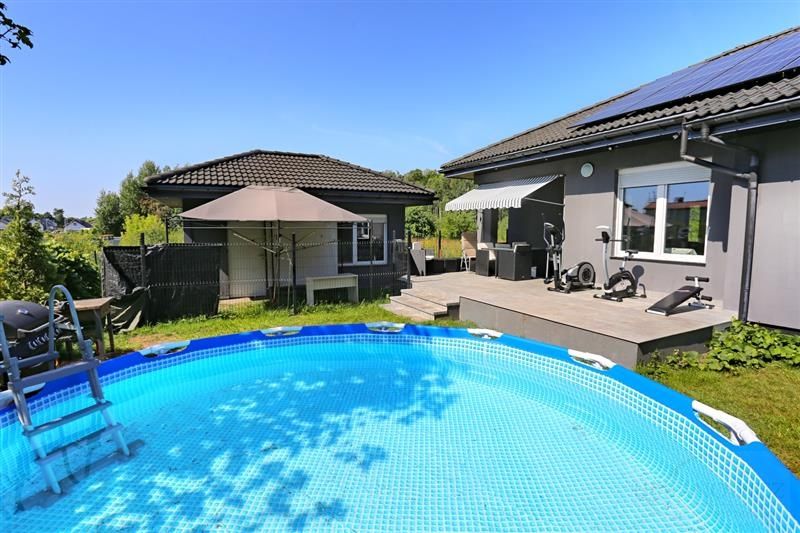 Dom posadowiony jest na działce o powierzchni 919 m². Teren w pełni ogrodzony, z licznymi nasadzeniami – krzewami, drzewami i roślinnością ozdobną. Na posesji znajduje się także basen stelażowy, idealny na letnie dni.