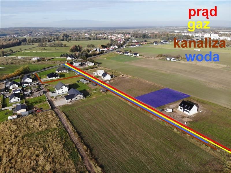 Media: prąd, woda, kanalizacja i gaz w drodze przy granicy działki.