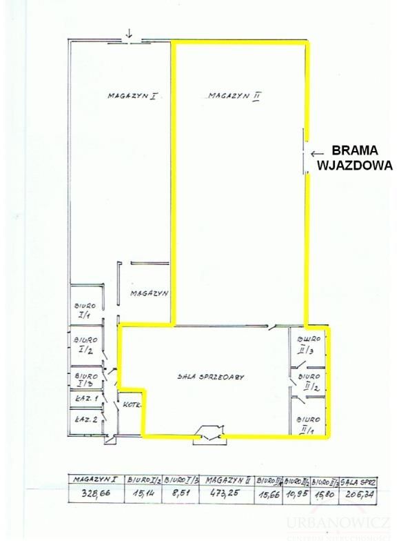 1 Większej: Magazynu o powierzchni 473,25 m2 dużej sali sprzedaży o powierzchni 206,34 m2, oraz trzech pomieszczeń biurowych o powierzchniach odpowiednio: 15,66 m2, 10,95 m2, 15,80 m2, hala sąsiaduje z drugim magazynem odzielona metalową ścianką