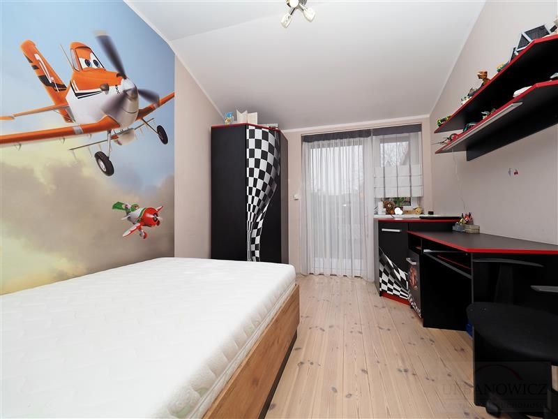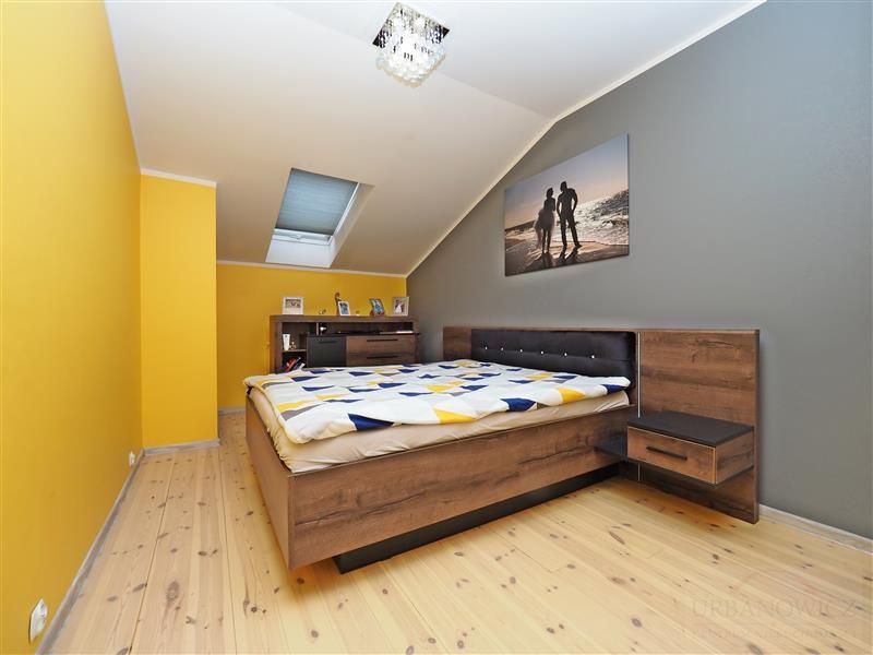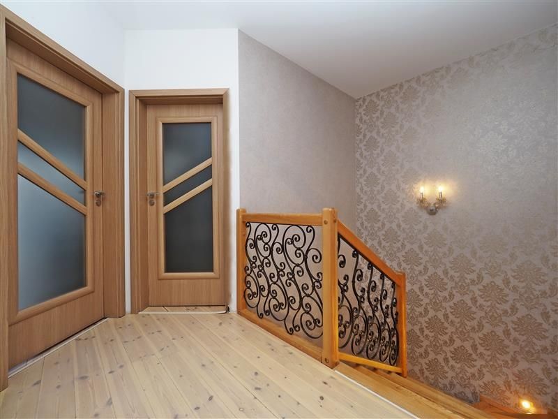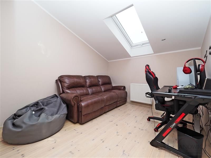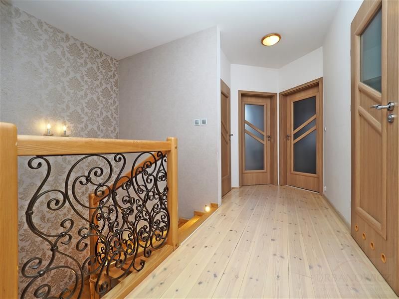 Na piętro prowadzą jesionowe, gustownie podświetlone schody z elementami metaloplastyki. Mamy tu przedpokój, z którego niezależnie wchodzimy do kolejnych pomieszczeń. Mieszczą się tu 4 ustawne pokoje, w tym jeden z wyjściem na balkon, łazienka z wc i garderoba.