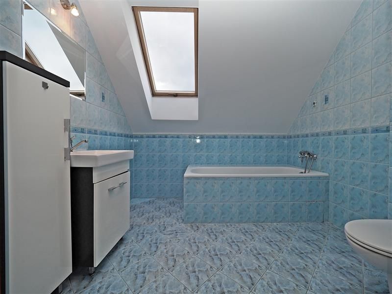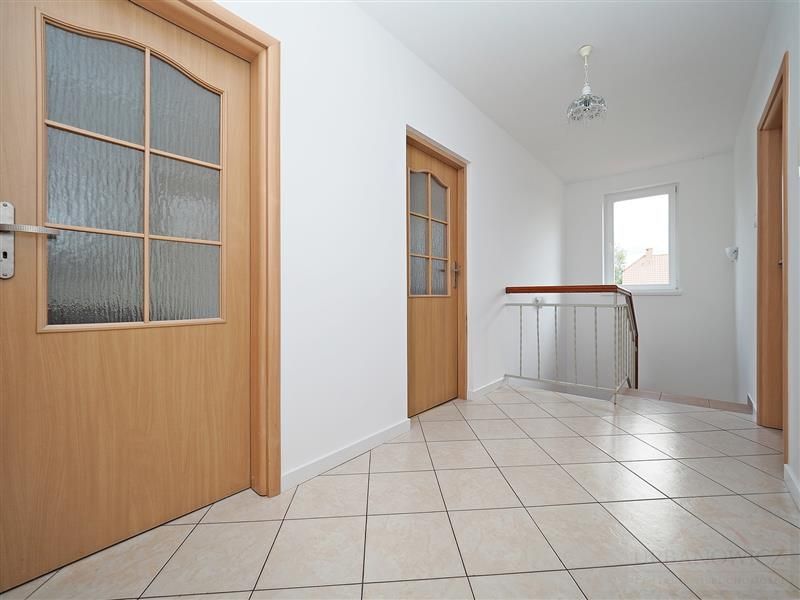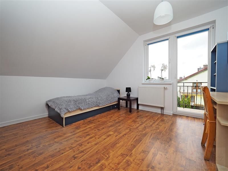 Na piętrze znajduje się przedpokój (ok. 6,73 m2), 3 sypialnie (ok. 13,24 m2, 10,09 m2, 9,75 m2), garderoba (ok. 3,7 m2) oraz łazienka z wanną (ok. 3,35 m2). Z 2 sypialni wyjście na wspólny balkon. W przedpokoju na piętrze znajduje się wejście na strych.