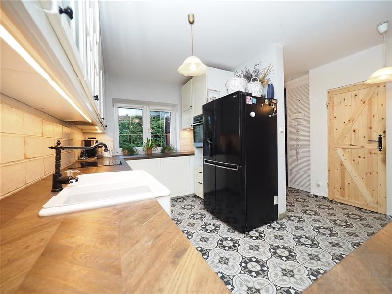Część dzienna domu po niedawnym, częściowym remoncie. Z salonu wyjście na taras poprzez duże, przesuwne drzwi tarasowe, a następnie schodami na ogród.