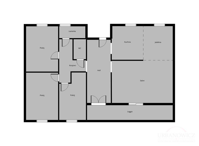 Mieszkanie o funkcjonalnym układzie pomieszczeń. Wejście poprzez reprezentacyjny, przestronny hall o powierzchni 10,86 m2. Serce lokalu stanowi przestronny salon (19,72 m2) z przejściem do jadalni (7,19 m2) i kuchni (7,54 m2). Z salonu wyjście na dużą loggię o powierzchni 11,02 m2. Druga część mieszkania tworzy strefę sypialnianą, gdzie mieszczą się 3 pokoje (10,89 m2, 10,89 m2, 8,24 m2), korytarz (5,15 m2), łazienka z oknem (3,67 m2) i osobne wc (1,23 m2). Układ mieszkania robi wrażenie.