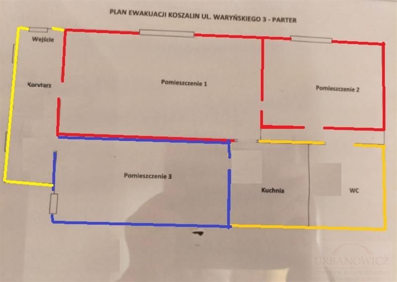 Do wynajęcia część lokalu o pow. 40.5m2 składająca się z dwóch pomieszczeń 22.5m2 i 18m2 (na planie zaznaczona kolorem czerwonym) z możliwością korzystania z kuchni i łazienki - 3.700 zł/m-c