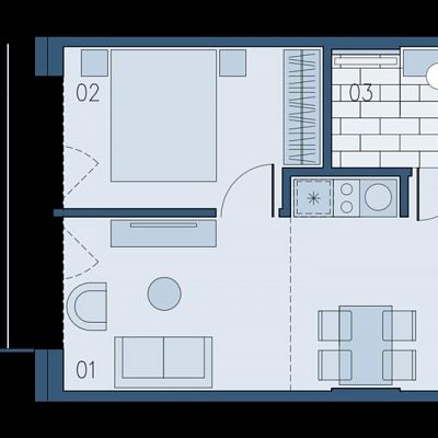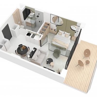 Pokój dzienny z aneksem kuchennym (20m2), sypialnia (9,59m2), łazienka (5,04m2).