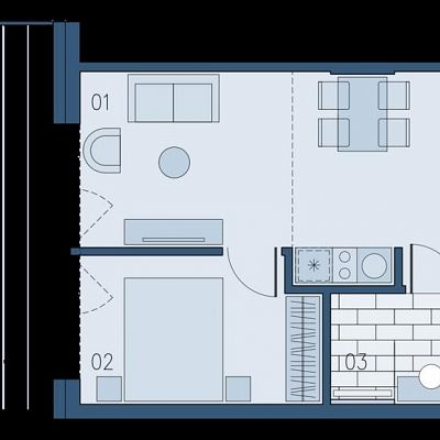 Pokój dzienny z aneksem kuchennym (21,38m2), sypialnia (9,59m2), łazienka (4,59m2).