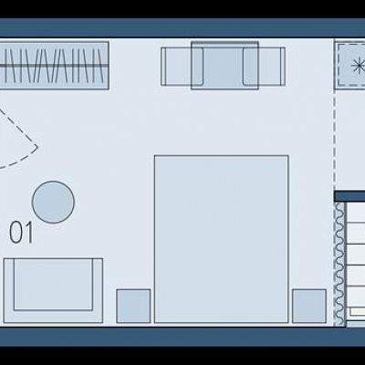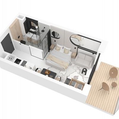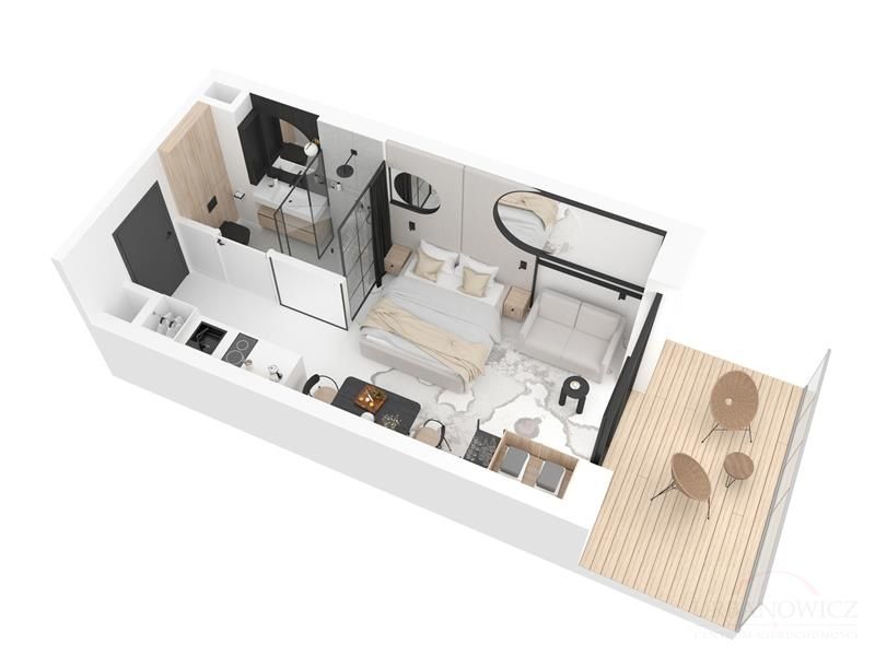 Pokój dzienny z aneksem kuchennym (19,19m2), łazienka (3,74m2).