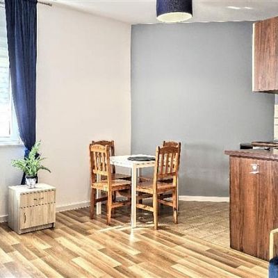 Bardzo ładnie doświetlony. W oknach żaluzje. Kuchnia zabudowa kuchenna, płyta indukcyjna, lodówka, mikrofala, czajnik elektryczny, stół, krzesła.